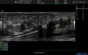 Case study: Well circumscribed irregular hypoechoic fluid collection measuring ~3.7 x 1.8 cm with complex mixed echogenicity showing peripheral vascularity and surrounding echogenic fat noted in the right upper midline at 12 o’clock position extending into the subareolar region.