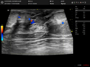 Conclusion: Well defined thick walled complex cystic lesion in the anterior midline of neck superior to normal thyroid gland. – Features suggestive of thyroglossal duct cyst